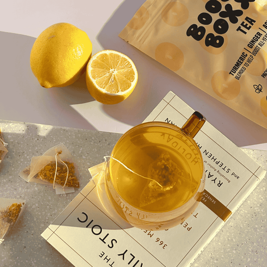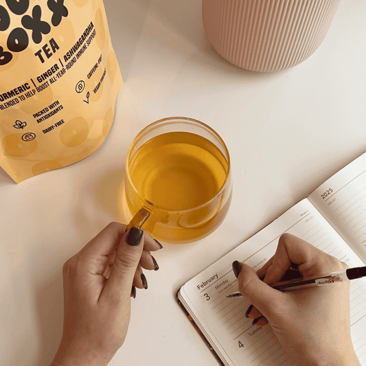 Boost Boxx tea has a naturally earthy, warming flavour, thanks to turmeric and ginger. It tastes smooth and comforting, with a hint of sweetness and spice, making it one of the best caffeine-free teas to support your immune system and digestion.
